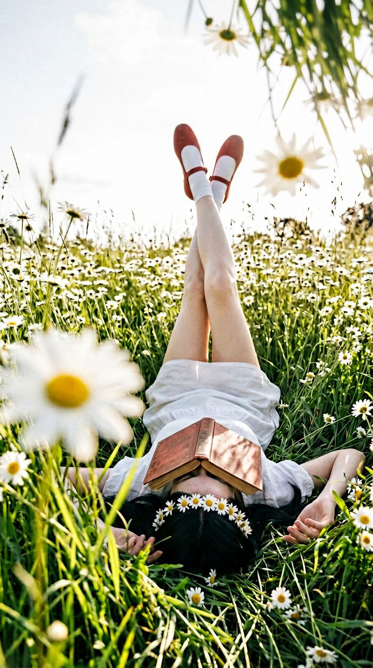 A realistic photograph with a strong dreamy summer atmosphere, 9:16 vertical composition. A young black-haired woman with nine-head proportions lies on her back in a dense field of blooming white daisies and tall fresh green grass meadow. Ultra-low ground-level camera angle, almost touching the grass, shooting upward from inside the flowers. One large daisy flower extremely close to the lens in the foreground, heavily out of focus, strongly invading and partially obscuring the left upper or left front of the frame. Her long black hair naturally scattered in the grass, wearing a delicate small white daisy flower crown. She wears a light, simple white short dress or mini dress with the hem stopping near the upper thigh, fully exposing large areas of her legs. Very short white ankle socks barely covering the ankles, paired with red Mary Jane flat shoes. Two vintage hardcover books with reddish-brown, wine-red or reddish-brown covers, slightly worn, casually placed open and completely covering her face, no facial features visible. Her body relaxes naturally into the grass, legs lifted upward and slightly crossed, legs dramatically elongated by the wide-angle low perspective, appearing extremely long, slender, fair, translucent, and softly luminous under sunlight with just the right gentle soft flesh, not overly skinny or bony. Legs are the strongest visual focal point, extending toward the bright sky, creating a light, clean, and highly present main line. Dense white daisies with yellow centers and vibrant green translucent grass blades surround and engulf her, creating an immersive 'swallowed by nature' feeling. Strong natural backlighting from above and behind, large areas of sky heavily overexposed to white, pronounced bloom, light haze, halos, and airy atmosphere. Soft, bright, bleached, dreamy light with high-key highlights, flower petals and grass edges glowing translucent. Overall high brightness, low contrast, clear, soft, cool green-biased color palette with st